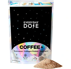 Everyday Dose Coffee+ is formulated to support sustained energy and focus without the crashes and jitters associated with regular coffee. The blend combines low-caffeine coffee with functional mushrooms and collagen protein for comprehensive wellness benefits.